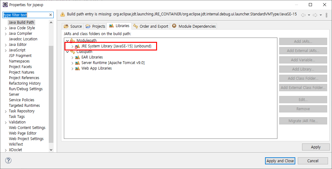 jdk 15 버전을 사용하다가 강의를 듣고 있는 jdk 버전이 11이기 때문에 15버전을 삭제하고 jdk11버전을 설치하고 eclipse로 작업을 진행하려고 하다가 에러가 발생되었습니다 ;;;