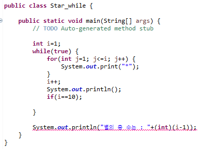 별들의 갯수를 아래로 내려가는 동안 하나씩 계속 추가하는 간단한 코드 입니다. 그런데 if ( i == 10 ) break문을 넣지 않은 경우인데 이러면 무한루프가 멈추지 않고 계속 반복문이 실행이 되는 코드가 됩니다. 그러면 System.out.println(" ") 문을 실행할 수 없게 되고 이러한 코드를 "dead code 에러" 라고 합니다.